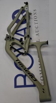 An Ican P9 150mm Travel full carbon fibre MTB Trial frame, size medium c/w rear thro axle, seat post clamp and headset. For flat mount disc brakes (Has some minor damage).