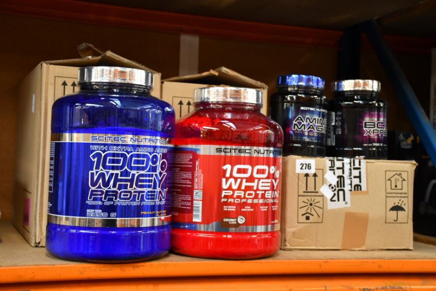 Three 100% Whey Protein Professional - coconut flavour (2350, 03/23), one 100% Whey Protein - peanut butter flavour (2350g, 03/23), two BCAA XPress Amino Acid Drink - pink lemonade flavour (700g, 01/23) and two Amino Magic 11 Component Amino Complex - apple flavour (500g, 03/23), all from Scitec Nutrition.