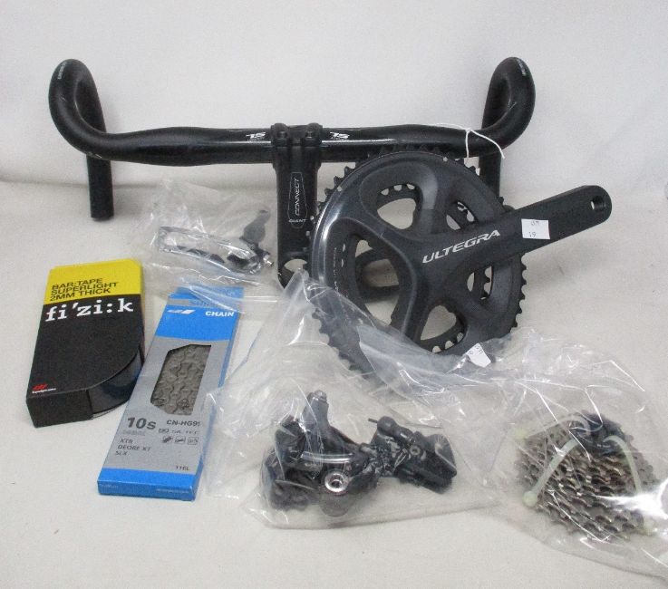 A lot containing mostly road bike components including Shimano Ultegra chainset, front and rear mechs, cassette, Giant drop handlebar and stem, Shimano chain, etc.