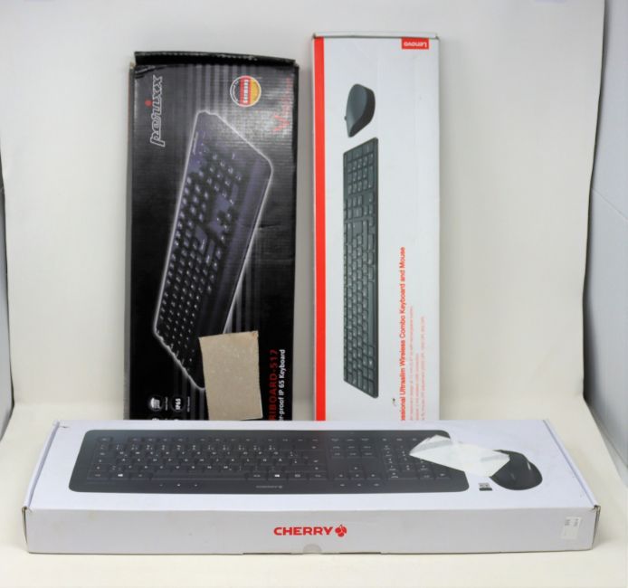 A boxed as new Cherry DW5100 Wireless Keyboard And Mouse Set (UK layout), a boxed as new Lenovo Pofessional Ultraslim Wireless Combo Keyboard And Mouse Set (UK layout) and a boxed as new Perixx Periboard-517 Waterproof Keyboard (UK Layout) (Boxes sealed, damaged boxes).