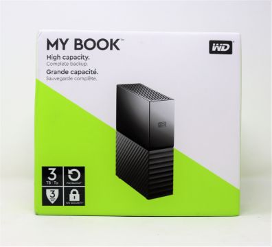 A boxed as new Western Digital 3TB My Book external desktop hard drive in black.
