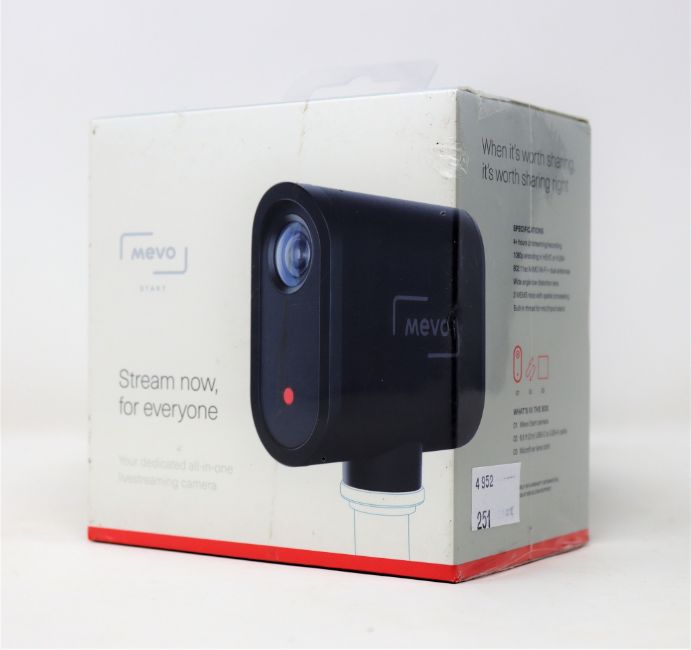 A boxed as new Mevo Start Live Streaming Camera (P/N: MV3-01B-BL) (Box sealed, some damage to packaging).