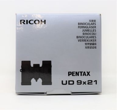 A boxed as new pair of Pentax 9x21 UD Pocket Binoculars in Grey/Orange (Box sealed, some damage to box).
