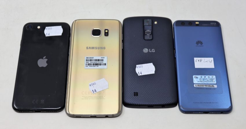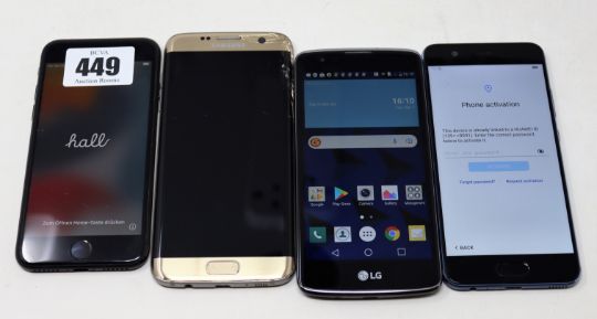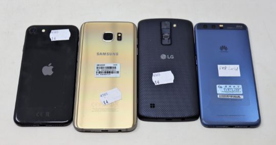 SOLD FOR PARTS: 4 smartphones; 1 x Apple iPhone SE 2 64GB in Black (iCloud locked, damaged screen glass), 1 x Samsung Galaxy S7 edge in Gold (FRP locked, damaged screen glass, battery fault), 1 x LG K8 4G8GB in Black (FRP clear) and 1 x Huawei P10 VTR-AL00 in Blue (FRP locked) (All phones sold as seen for parts only).