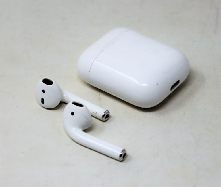 A pre-owned Apple Airpods (2nd Gen A2031+A2032) with charging case (A1602) (Some cosmetic marks to Airpods and case).