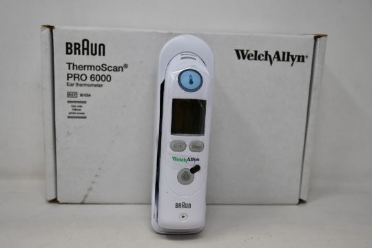 A boxed as new Welch Allyn Braun ThermoScan PRO 6000 ear thermometer with cradle.