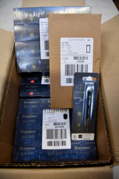Twenty four Waterman bottled ink (50ml) in blue/black and red, twelve Parker Quink bottled ink (57ml) in blue, twelve Parker Quink Gel ball point pen refills and six Parker Jotter Gel Pens black with blue ink, all as new.