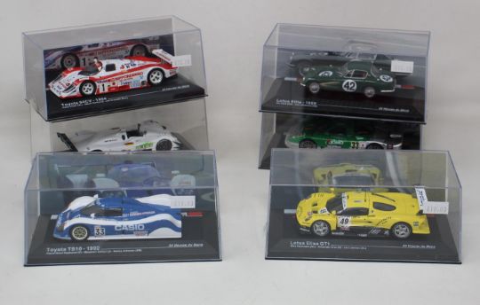 A collection of thirteen 1:43 scale motor racing model cars from multiple manufacturers. To include 1:43 scale 24 Heures du Mans Toyota 94CV- 1994, Nissan R390GTI- 1998, Lotus Elite- 1959, Lotus Elise GT1 and a Toyota TS10- 1992. Deagostini 1:43 scale: Toyota Corolla WRC- Rally Monza 2004 and a Peugeot 206WRC- Rally Mille Miglia- 2003. Grand Prix 1:43 scale: Lotus 78 Ford- 1978 and a Lotus Type 498- 1968. Together with a 1:43 scale Nissan R390 Gt1- Le Mans 1998, a 1:43 scale Delprado Toyota 7- 1970, a 1:43 scale MiniChamps Williams Race Livery- 2008 and an Onyz BMW V12 LMR ‘Beck’s’ Las Vegas- ALMS 1999. (100-150).