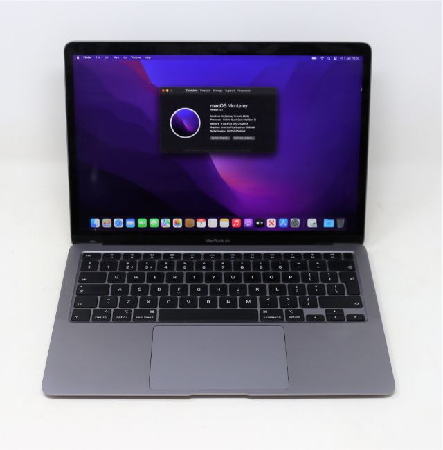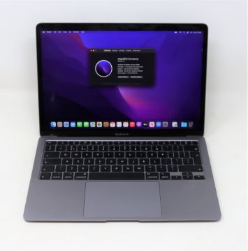 A pre-owned 13" Macbook Air (2020) with Intel 1.10GHz quad core i5 CPU, 8GB RAM, and 250GB SSD in space grey (some damage to lower left screen bezel) (no charger).
