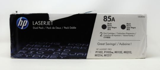 Two boxed as new HP 85A (CE285AD) Black Toner Cartridges (Boxes sealed, some damage to plastic wrap packaging).