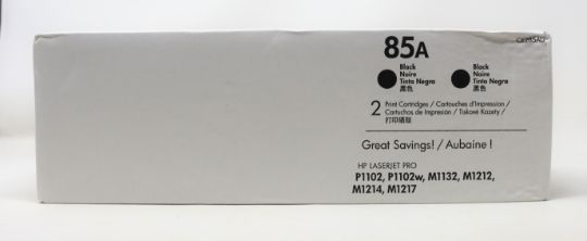 Two boxed as new HP 85A (CE285AD) Black Toner Cartridges (Boxes sealed, some damage to boxes. Missing plastic wrap packaging).