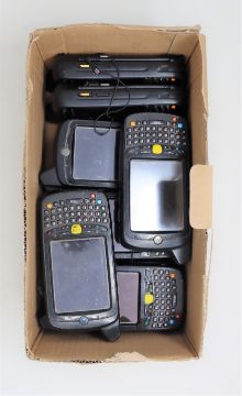 Eight pre-owned Motorola MC659B-PDOBAA00100 Hand Held Computer/Barcode Scanners (No batteries included).