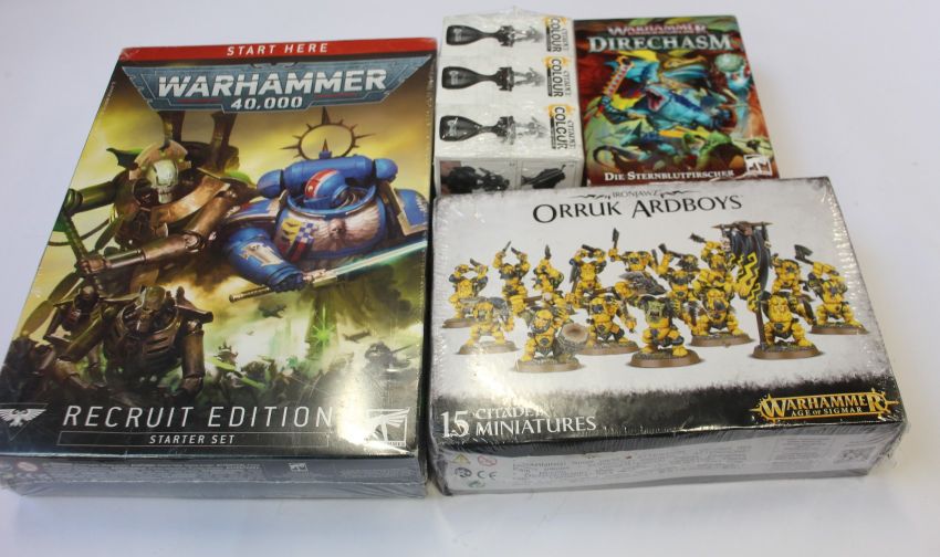 A quantity of Warhammer 40,000 miniatures and related items to include two recruit edition starter sets, two boxed Drukhai Scourges sets, ten Citadel 20g plastic glue bottles, six Citadel painting handles and other related items.