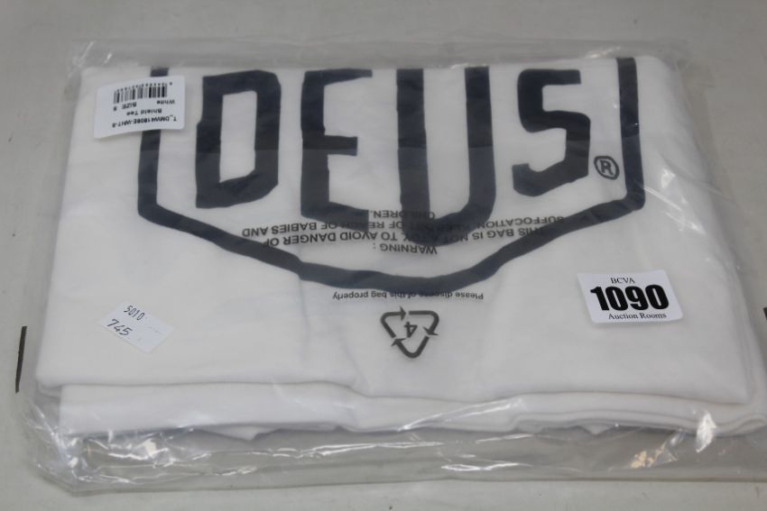 Six as new Deus Ex Machina Shield T-shirts in white (1 x S, 2 x M, 3 x L - RRP £32 each).