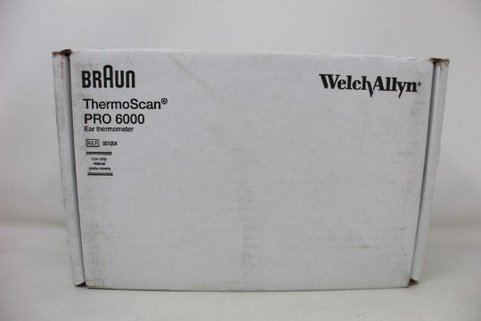 A boxed as new Welch Allyn Braun ThermoScan PRO 6000 ear thermometer with cradle.