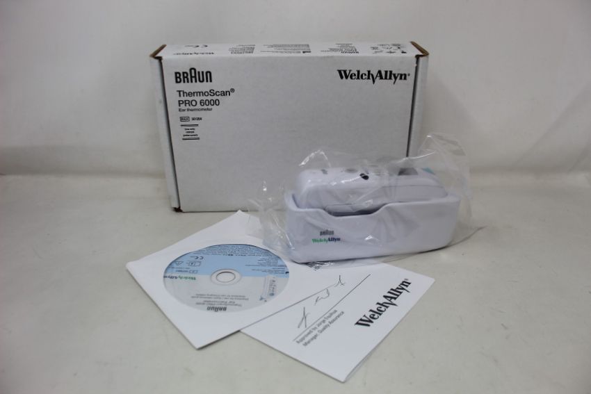 A boxed as new Welch Allyn Braun ThermoScan PRO 6000 ear thermometer with cradle.