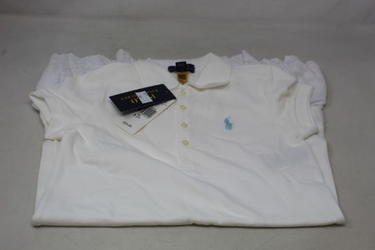 Seven girls as new Ralph Lauren polo dresses in white (Sizes 4T, 6, 6X, 7, 8-10, 12-14, 16).