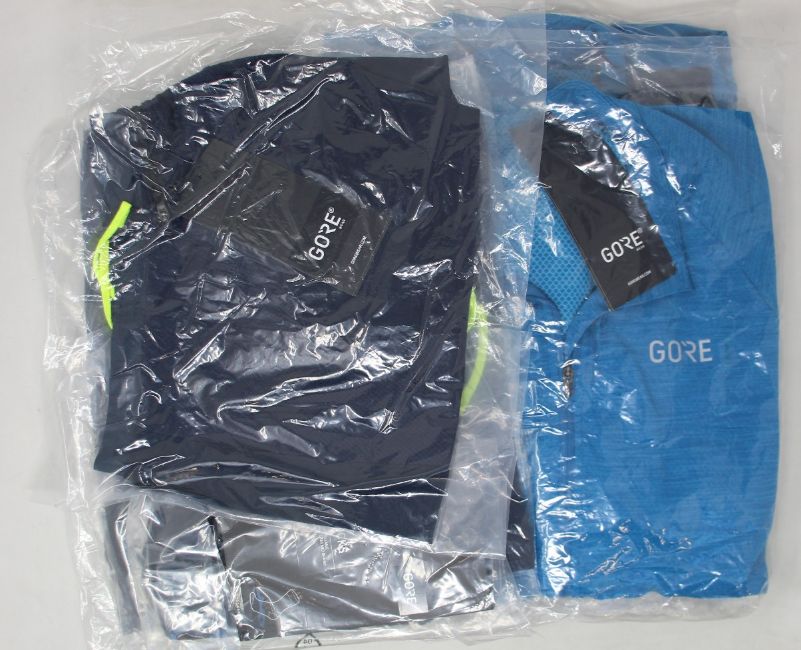 Two as new Gore Wear C3 sphere blue jerseys (Medium/small), two as new Gore Wear black 2 in 1 shorts (large /X-large) and two pairs of Gore Wear socks (X-large).