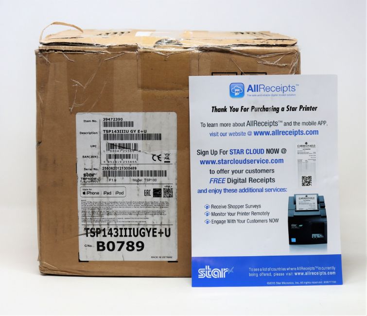 A boxed as new Star TSP143IIIU USB POS Receipt Printer (P/N: 39472390) (Box damaged, opened).
