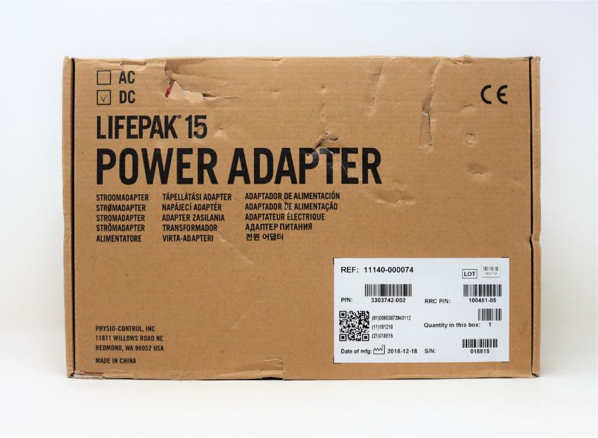 A boxed as new Physio-Control LIFEPAK 15 DC Power Adapter (P/N: 11140-000074) (Box opened, damaged box).