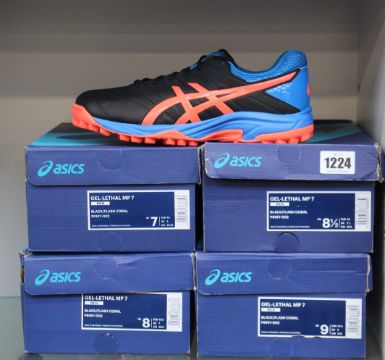Four pairs of men's as new Asics Gel-Lethal MP 7 trainers (UK 6, 7, 7.5, 8).