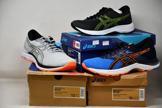 Three pairs of men's as new Asics trainers; Gel-Contend 6 (UK 5), Gel-Flux 5 (UK 8.5) and Gel-Excite 7 (UK 11).