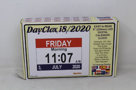 Five boxed as new Dayclox 8" LED digital calendar clocks (Requires UK adaptor).