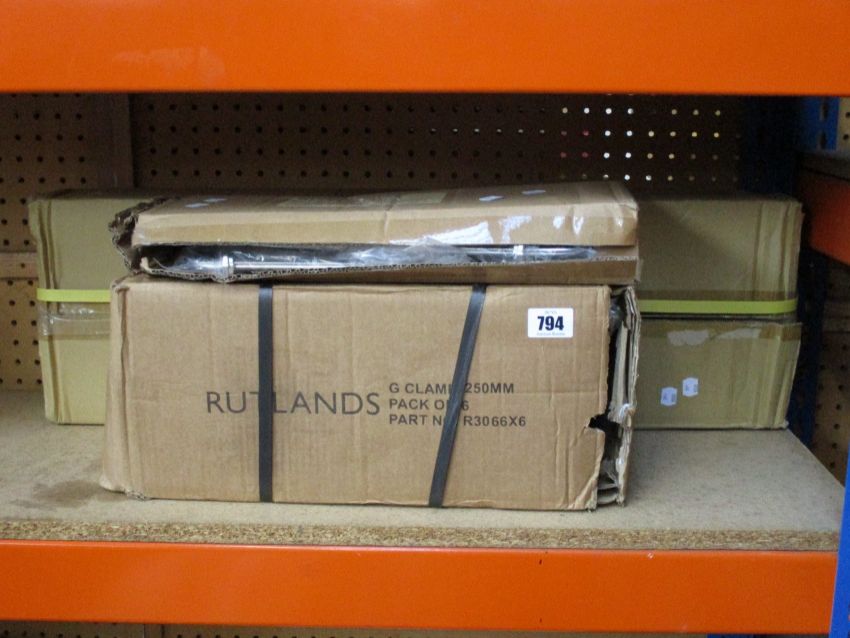 Four boxed as new Rutlands aluminium one hand bar clamps (600x85mm, R3055), four Rutlands forged quick lever clamps (300x80mm, R3030) and Six Rutlands 10" G Clamps (250mm, R3066).