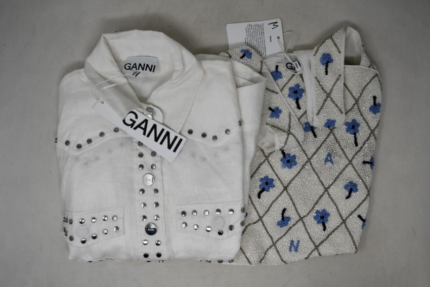 An as new Ganni Phantom shirt in white (32) and a beaded crop top (36).