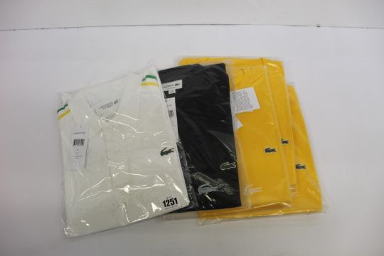 Two as new Lacoste Polo shirts (FR 3, 4) and four Lacoste yellow T-shirts (2 x Fr 4, 2 x Fr 5).