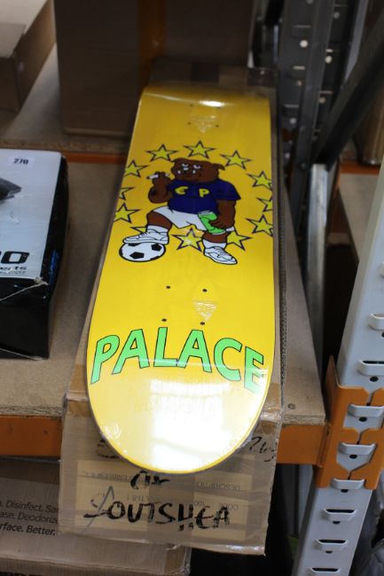 Three as new Palace Bulldog skateboard decks and two as new Palace Eine Stein skateboard decks.