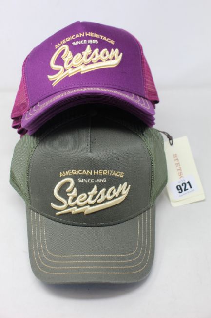 Six as new Stetson Heritage baseball caps in green together with four in purple (RRP £33 each).