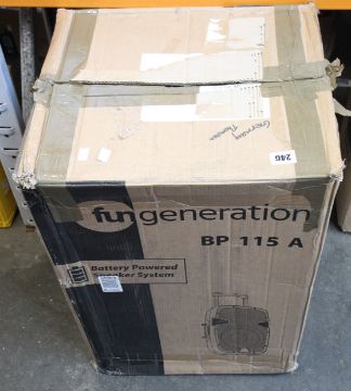 A boxed Fun Generation BP 115 A battery powered speaker system (Box unsealed).