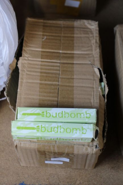 Fifty boxed as new Budbomb tobacco pipes with extended smoke paths in black and gold.