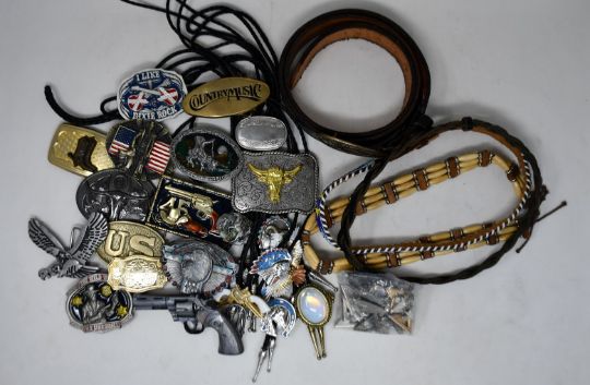A quantity of belts, belt buckles, Bolo ties with brands to include Bergamot, Baron Buckles and Transide.