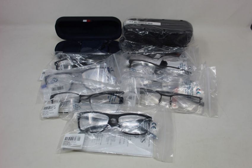 Eight pairs of assorted as new Tommy Hilfiger glasses frames with three cases.