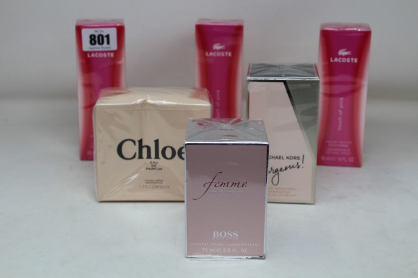 Three Lacoste Touch of Pink eau de toilette (50m), a Hugo Boss Femme eau de toilette (75ml), a Michael Kors Gorgeous eau de parfum (100ml) and a Chloe eau de parfum (50ml), all boxed as new.