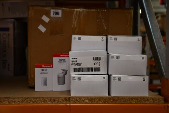 A large quantity of boxed as new Honeywell IS312B Pet Tolerant Passive Infrared Motion Sensors with Swivel Bracket (Approximately 90), ten Resideo IRPI8M motion sensors and five similar IS312, all boxed as new.