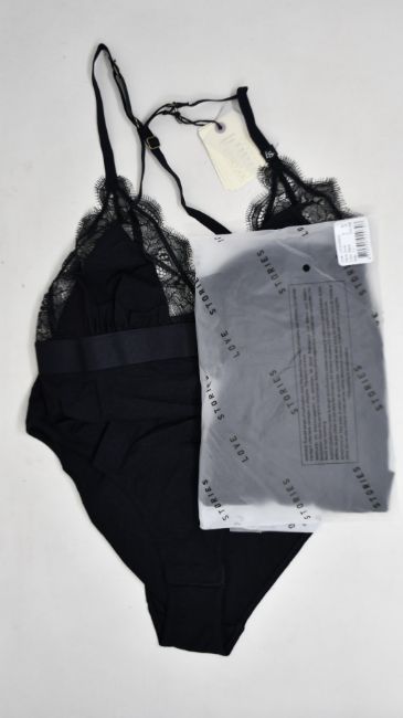 Three as new Love Stories Doris black bodysuits with lace trim (1++/32 E-F - RRP £85 each).
