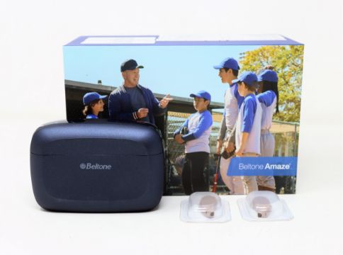 Two boxed as new Beltone Amaze Hearing Aids in Light Grey (HI,AMZ963-DRWC,LGR) and a Beltone Amaze Charger (CHARGER,LXR,BT,AMAZE) (Boxed, 2-Pin charger, USB cable and Danish language manual included).