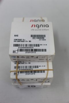 Five boxed as new Signia Contrast S+ hearing aids in Beige.