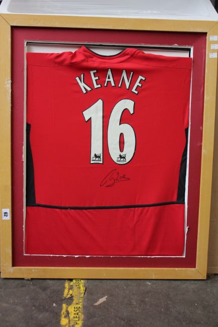 A pre-owned Roy Keane signed Manchester United 16 shirt (Item is in a damaged frame, may be slightly damaged, may have broken glass!).
