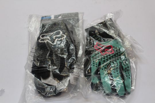Two Fox Enduro knee sleeves (M, L), a Fox Enduro Pro knee guard (M), Fox Enduro D30 knee guard (L), Fox Enduro elbow guard (M), two Fox Hip Packs, three Dirtpaw gloves (XL, XXL, XXXL), Fox Legion thermo glove, a pair of Fox Defend gloves (L) and six Fox TruDri Chop Shop snapback caps.
