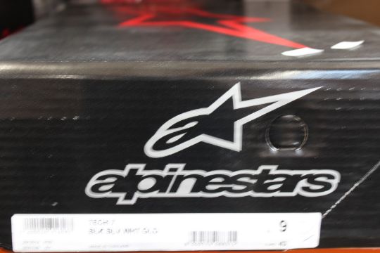 A pair of Alpinestars Tech 7 motocross boots in black, silver, white and gold (Size US 9 / EU 43).