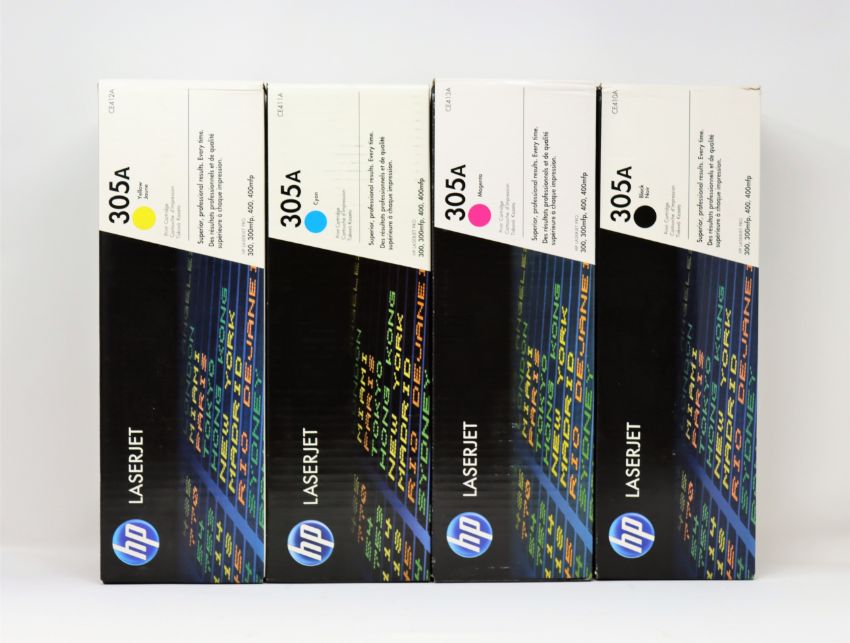 COLLECTION ONLY: A quantity of boxed as new HP LaserJet Ink Cartridges; 5 x 87A Black, 3 x 305A Cyan, 3 x 305A Yellow, 3 x 305A Magenta and 3x 305A Black.