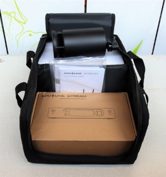 COLLECTION ONLY: An as new Spottune Stream Wireless Audio Streamer and Two Spottune Omni Wireless Track Speakers (1 x White / 1 x Black. Possibly pre-owned) in a custom carry bag.