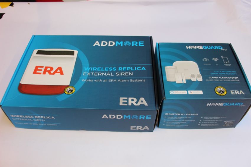 A boxed as new ERA Homeguard Pro fully integrated smart home security system and an ERA AddMore wireless replica external siren.
