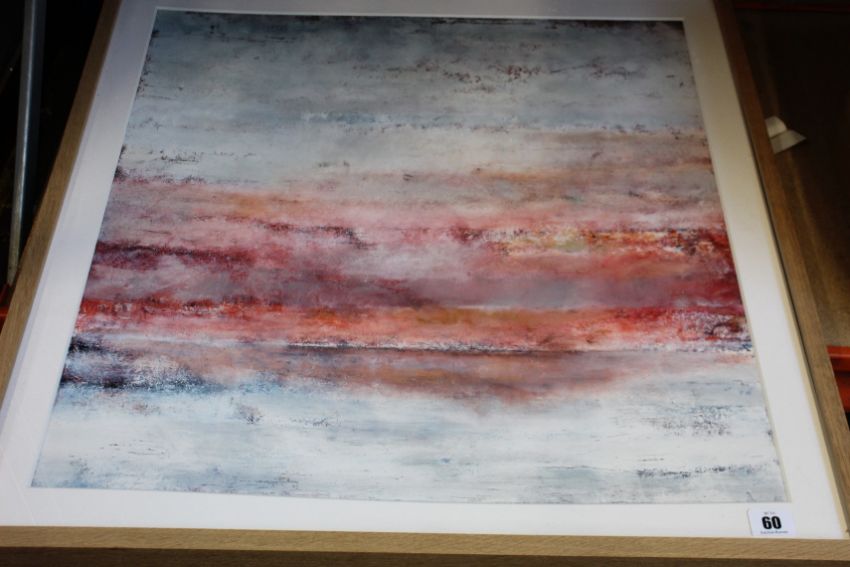 'Afterglow' framed art print by Liz Jamerson, natural oak wood frame 82cm x 82cm (RRP: £190, top right hand corner is damaged/in need of some minor repairs).