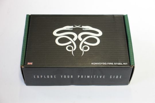 Five boxed as new KonvoySG Fire Kits - tan leather (Carbon steel fire striker, English flint stone and char cloth traditional hand forged fire starter, leather gift kit with emergency tinder jute bag).