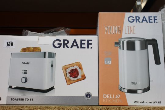 A Graef Young Line WK 61 Electric Kettle (1.5ltr) and a Graef Toaster TO 61, both boxed as new.